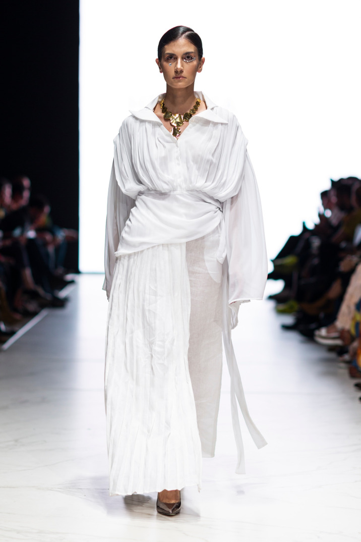 Ideas on lightness, movement and flow being contrasted with the ideas of blockage, binding and roughness are seen; the dichotomies of constraining and freeing silhouettes are matched with elements of distortion, foldings, different attributions of bodily terminology and diverse references to worldwide popular garmentry and artisanal techniques. Beadwork within the collection was worked alongside women-led artisan collective Artediba.